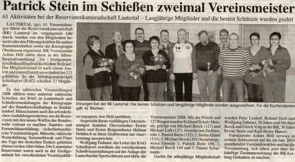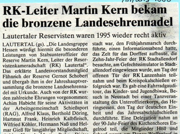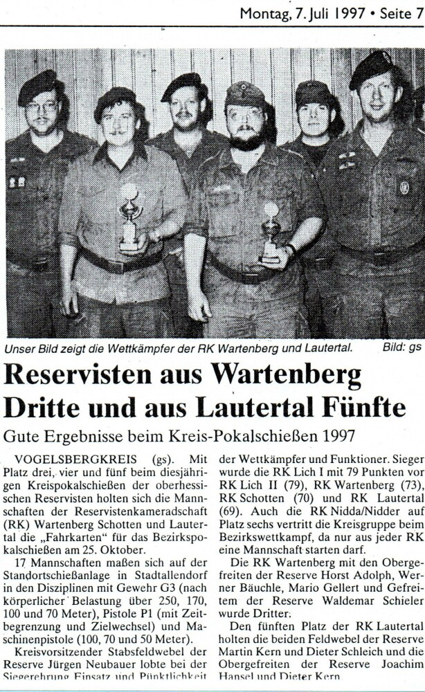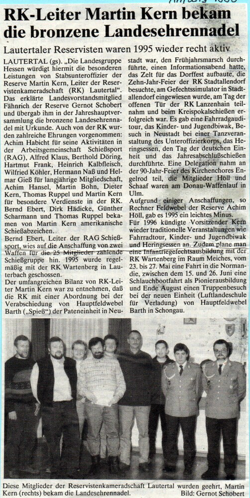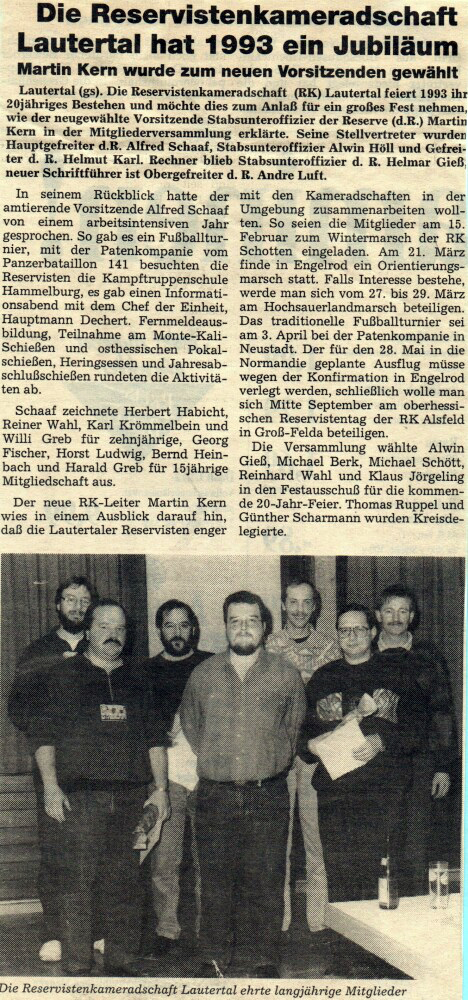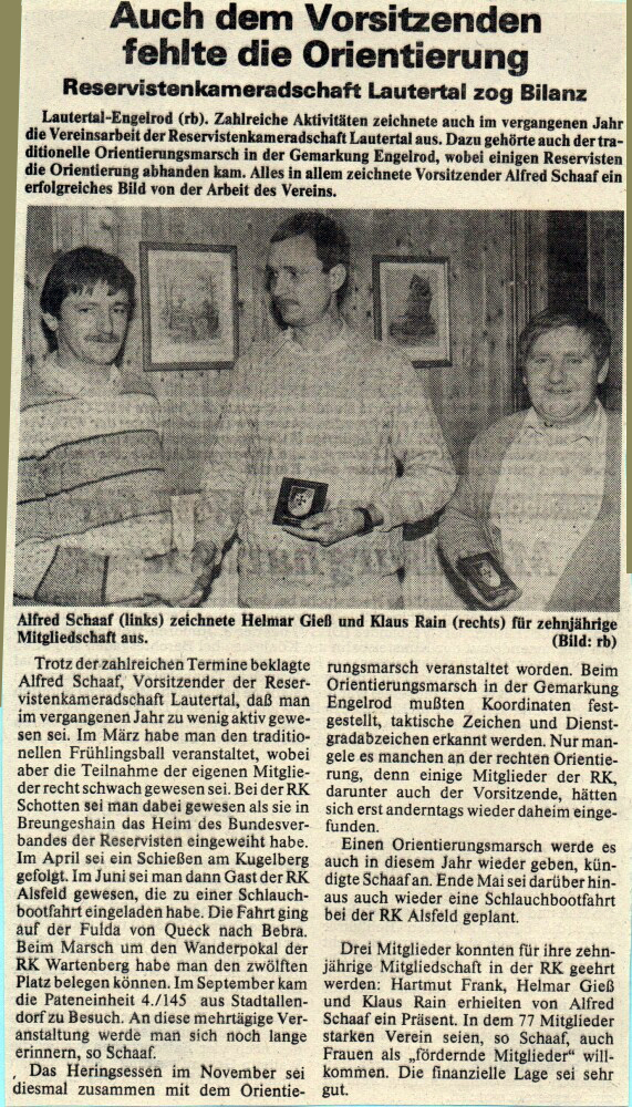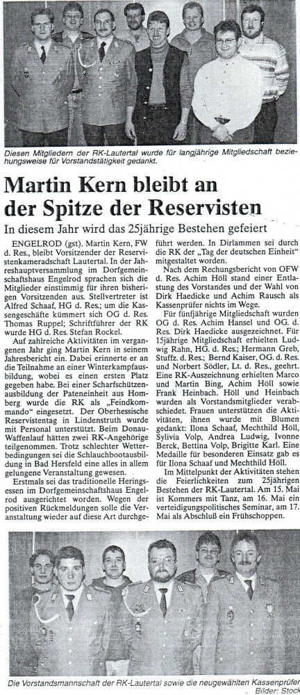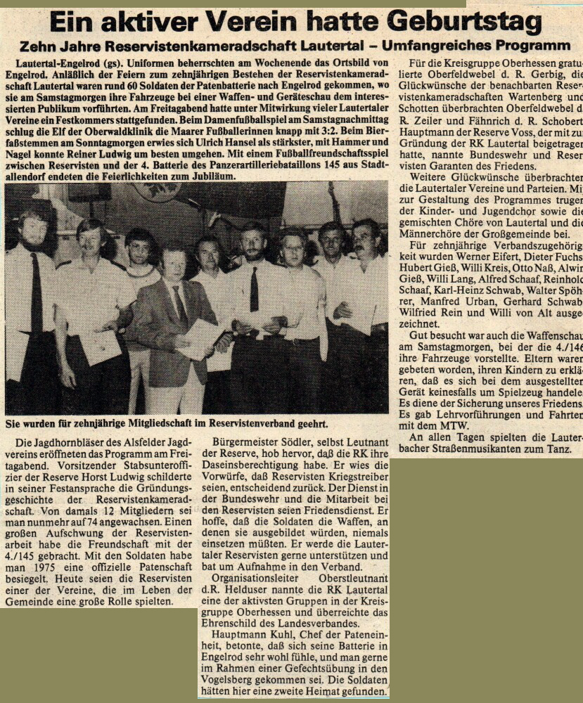Erster Vorsitzender war der Obergefreiter d.R. Alwin Höll, der Vater des derzeitigen Vorsitzenden Achim Höll. Die Engelröder Gruppe wuchs, weil sich auch Ungedienete dem Reservistenverein anschlossen. Später nahm die RK den Namen der Großgemeinde Lautertal an. Die Reservisten pflegten die Kameradschaft zur 4. Batterie des Panzerartilleriebatailons aus Stadtallendorf. Da gab es unter anderem Fussballspiele, Feinddarstellung bei Manövern, Winterkampfausbildung, Besuche der Barbarafeiern und bei Kommandoübergaben. Diese 4./145 ist 1985 bei der Heeresstruktur 5 ausser Dienst gestellt worden. Am 24. September 1988 wurde eine Patenschaft mit der zweiten Kompanie des Panzerbataillons 141 aus Neustadt / Hessen geschlossen. Mit ihr wurde Kraftfahrerweiterbildung durchgeführt. Diese Einheit wurde, wie so viele andere, nach der Wiedervereinigung und nach Aussetzen der Wehrpflicht aufgelöst. Es gab Teilnahmen am Donau-Waffenlauf in Ulm, am Vier-Tage-Marsch in Nimwegen, mit großen Erfolgen an Wettkämpfen der Kreisgruppe, Schießveranstaltungen, die Gründung einer Arbeitsgemeinschaft Schießsport, Schlauchbootfahrten, Aus-und Weiterbildung zum Erhalt der militärischen Fähigkeiten und die Durchführung von Ferienspielen. Diese Liste ließe sich fortsetzen.